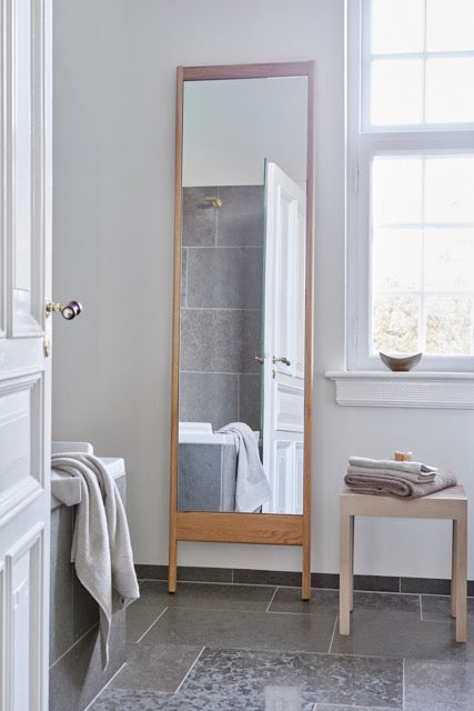 Gulvspejlet, A Line Mirror fra Form & Refine, er et minimalistisk fritstående spejl med en god højde, der opfylder forskellige behov. Spejlets ben er formet som en rund rombe, hvilket giver et mere detaljeret udseende. Rammen gør samtidig spejlet holdbart. Spejlet er perfekt til soveværelse, entre eller badeværelset.